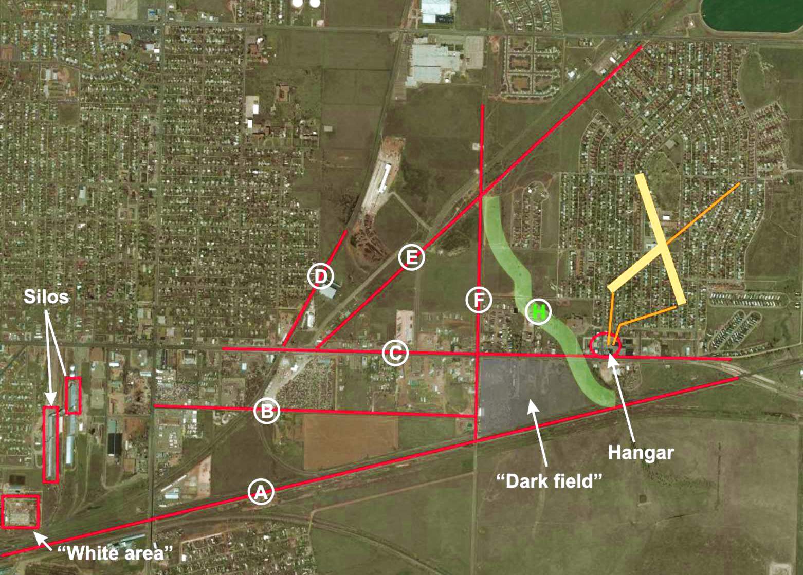 Prior to finding the old photograph, working with the 1944 Oklahoma City SAC, the location was estimated to be a triangle bounded by roads C, E, and F.