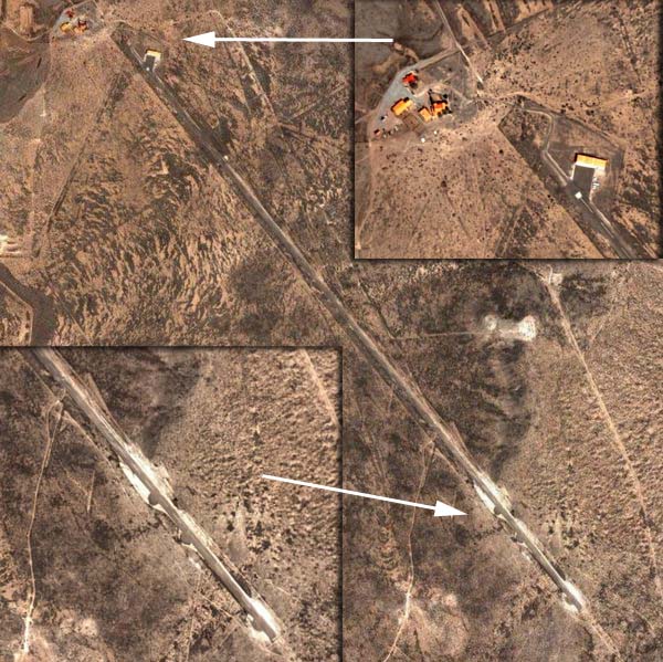 "Unknown" airfield with close up inserts at top and bottom. (Google Earth picture c. 2001-5)