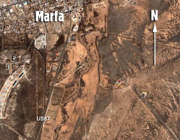 Wide view showing the "unknown" airfield on the SE side of Marfa. (Google Earth)